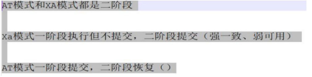 XA模式一阶段不提交事务,锁定资源,AT模式一阶段直接提交,不锁定资源。XA模式是强一致,而AT模式是最终一致。