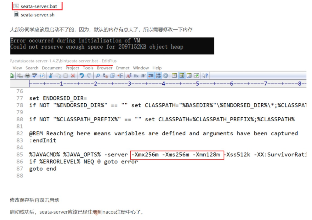• 下载Seata 解压后在bin目录下下运行,如果运行失败的话就修改一下配置文件,把内存值调低一点。