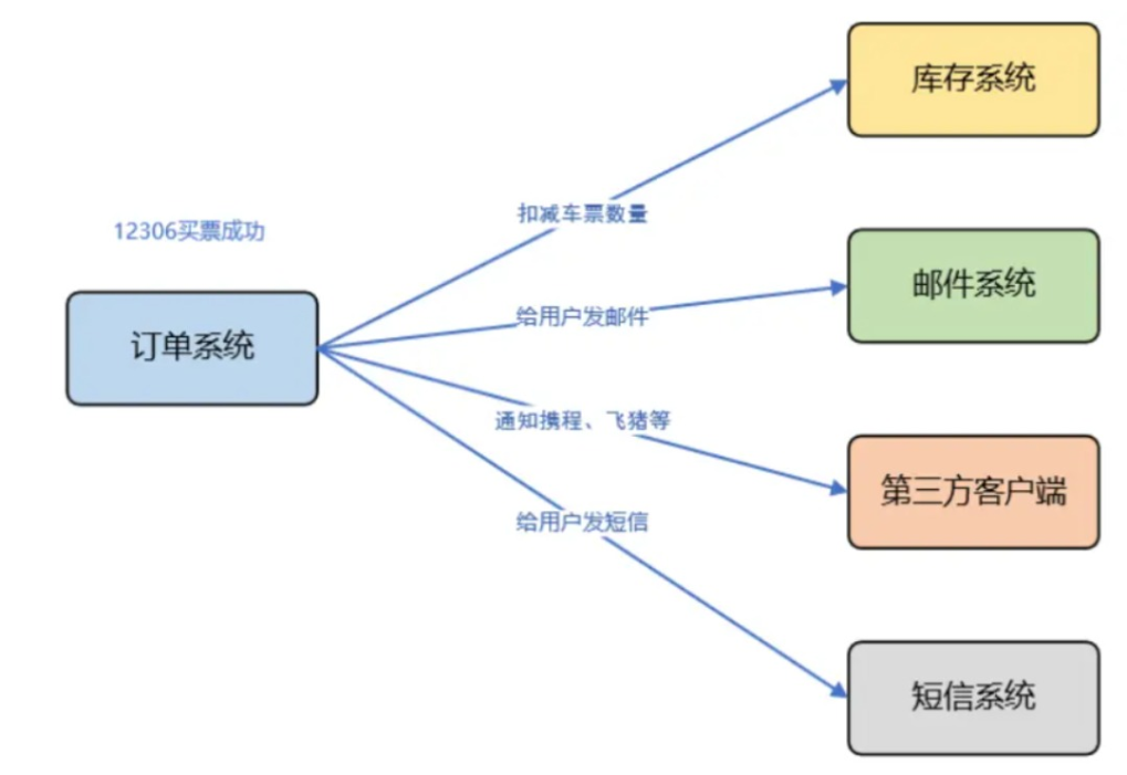 假设我们做了个12306系统,我们买票成功后,需要做以下几件事:调用库存系统扣减车票库存,调用短信系统给用户发送短信,调用邮件系统给用户发邮件,调用第三方客户端通知买票成功。那么如果这几个服务一直能正常服务,产品经理不在有新的需求变更,那也可称得上现世安稳,岁月静好。可是万一有一天出现这么两种情况可怎么办呢?