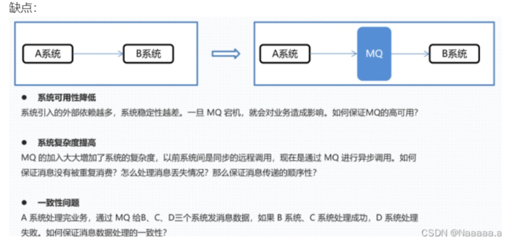 最致命的却带你是假如中间MQ出现了宕机,其他系统也不能执行了。