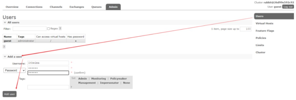 rabbitmq:3.8-management账号密码初始都是:guest 开发中咱们不会接触管理员用户,所以这里创建自己的用户