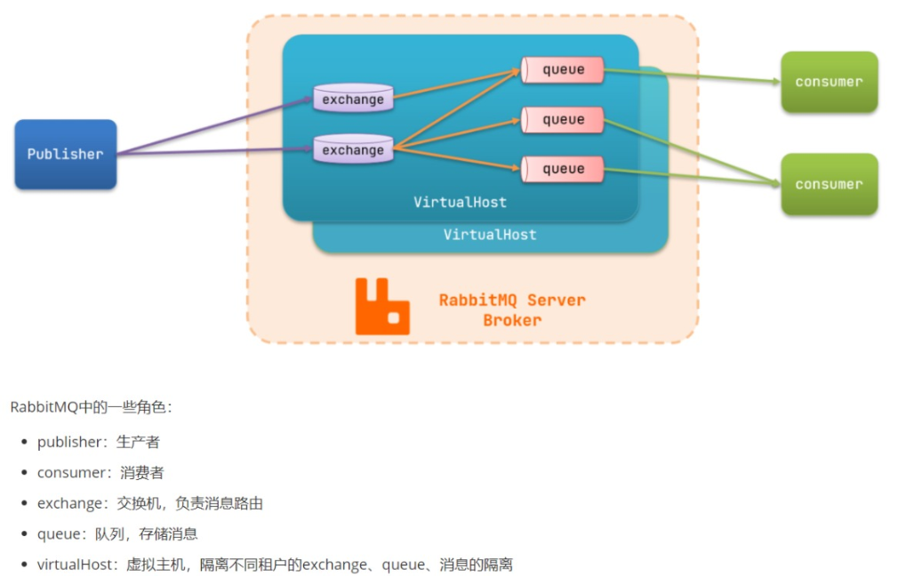 发布者发布消息后,我们通过交换机接收消息,然后传给队列,队列存储消息,然后再发给各个消费者,生产者能发多个消息,也可以有多个交换机接收,同样,交换机也可以发送多个消息给队列,队列也可以给多个消费者发送消息。