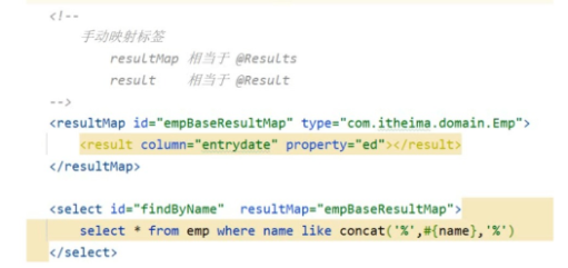 select * ,entrydate as ed from emp;2 : 交给框架帮我们映射,通过@Resultes及@Ressult进行手动结果映射,但是如果用xml映射的话,就不能和这个注解混合用了