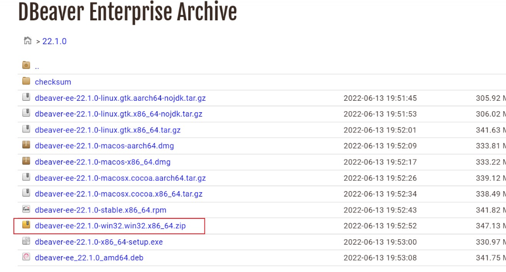 DBeaver Enterprise 22.1 企业版激活方法(windows) 1:下载jar包 链接 https://pan.baidu.com/s/1l2X4g2PPtPqZGTf1uVij5A 提取码:1999 2:下载DBeaver22.1版本 https://dbeaver.com/files/22.1.0/