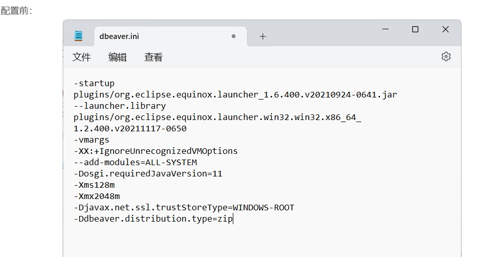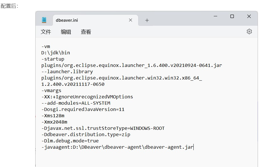 -javaagent:D:\DBeaver\dbeaver-agent\dbeaver-agent.jar 刚才下载的jar包路径这个jar包就是你刚才下载的jar包,前面路径配置绝对路径